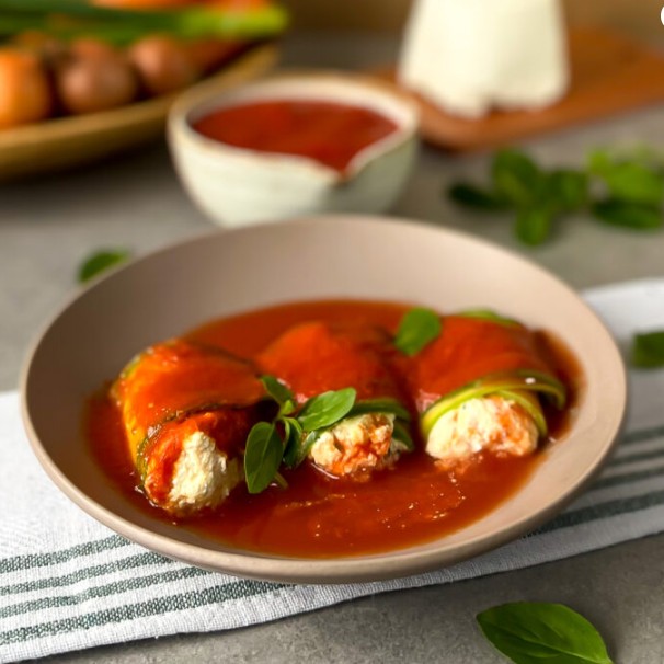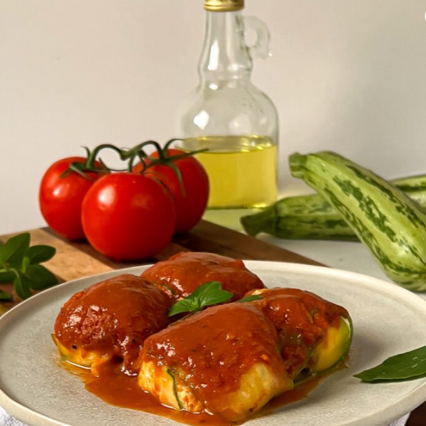 Generosos canelones de abobrinha recheados com ricota e cobertos com o nosso delicioso molho de tomate. Prato muito saudável!