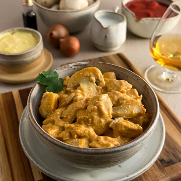 Cubos de peito de frango grelhados e finalizados em molho a base de molho de tomate, molho inglês, creme de leite e especiarias.