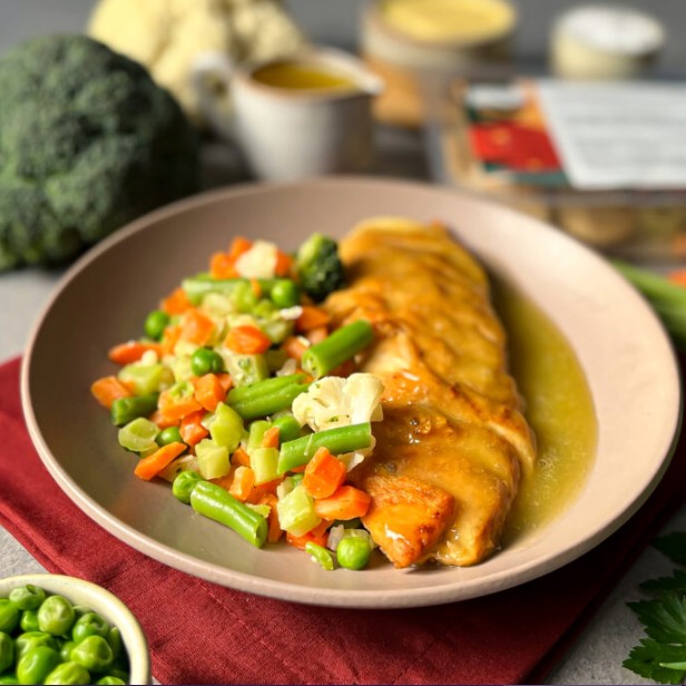 Suculentas fatias de peito de frango cuidadosamente grelhadas, cobertas por um saboroso molho de laranja fresca, acompanhado de uma deliciosa seleta de legumes composta por brócolis, couve-flor, vagem, ervilha e cenoura, delicadamente puxada em manteiga clarificada feita em nossa cozinha