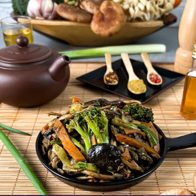 Mix de cogumelos shitake e shimeji, abobrinha, brócolis e cenoura, envolvidos num molho preparado com azeite, molho shoyu, conhaque, alho-poró, curry e um blend de pimentas que dá o toque apimentado a este prato oriental.