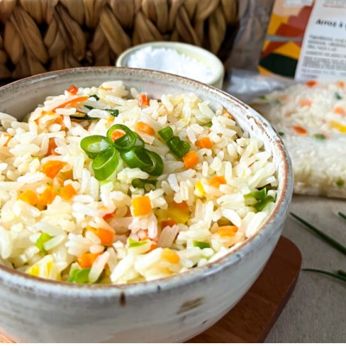 Aquele mesmo arroz branco, soltinho e super bem temperado, acrescentado de uma dose extra de nutrientes vindos doa mais variados legumes: pimentão, cenoura e cebolinha. Tudo bem picadinho e carinhosamente adicionado ao arroz, durante o cozimento. Comida de verdade, da nossa cozinha para o conforto da sua casa.