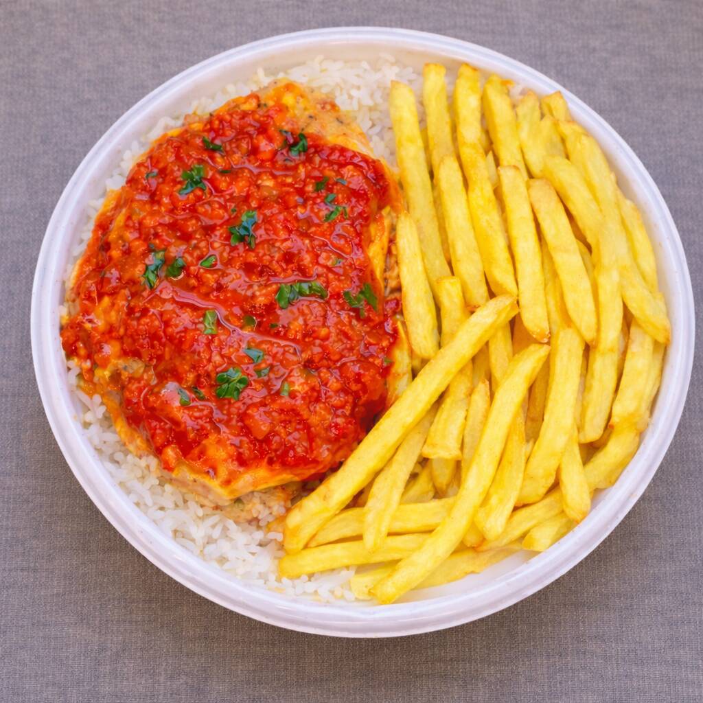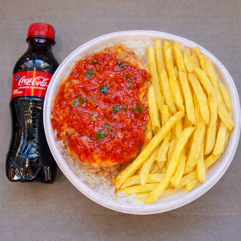 Acompanha: Arroz (Camil) ,Feijao (Camil) (OPCIONAL), Empanado (Farinha Panko), Queijo Mussarela, Molho de Tomate(Ekma), Batata frita (Bem Brasil) e Coca-Cola 200ml.