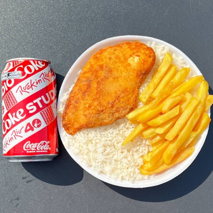 Marmita com delicioso filé de frango empanado na massa crocante acompanhado de arroz branco, feijão e batatas fritas. Acompanha refrigerante lata Coca Cola 350ml bem gelada. Marmita indicada para 01 pessoa.