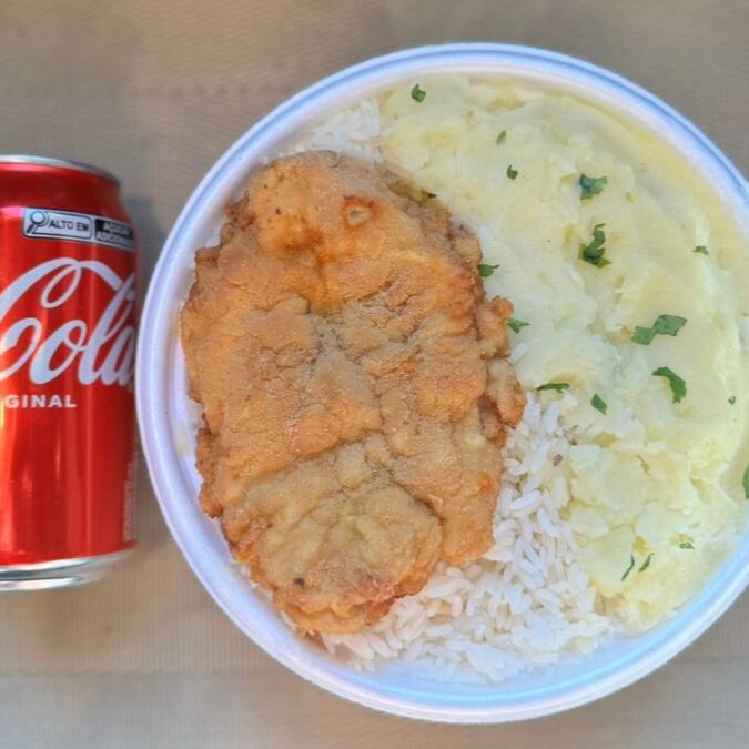 Marmita com delicioso filé de frango empanado na massa crocante acompanhado de arroz branco, feijão e purê de batatas inglesas. Acompanha refrigerante Coca Cola lata Zero sem açúcar 350ml bem gelada. Marmita indicada para 01 pessoa.