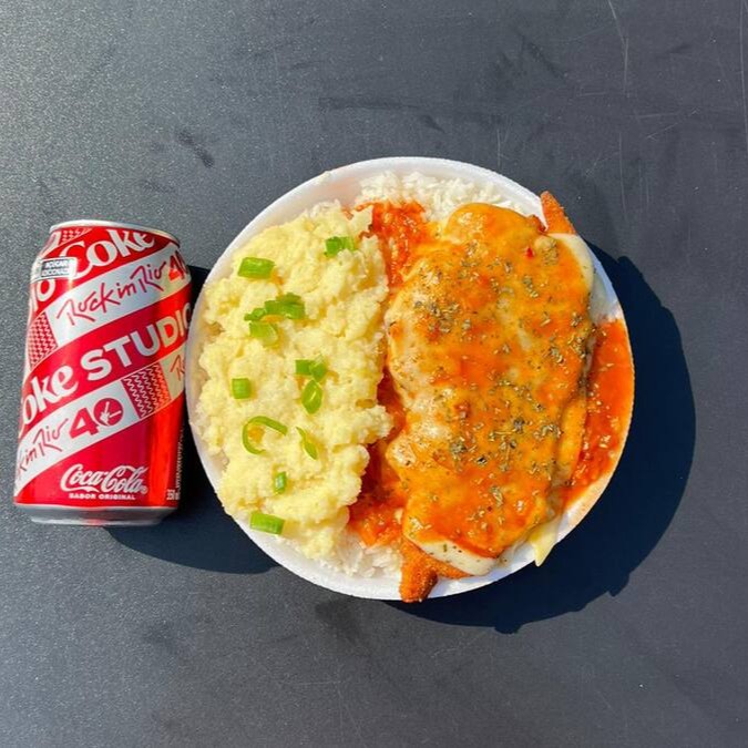 Marmita com delicioso filé de frango parmegiana (empanado na massa crocante coberto com molho de tomates e queijo) acompanhado de arroz branco e purê de batatas inglesas. Acompanha refrigerante pet Coca Cola bem gelado. Marmita indicada para 01 pessoa.