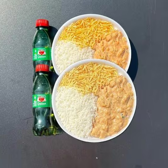 Marmita com delicioso filé de frango ao molho estrogonofe acompanhado de arroz branco e batatas fritas. Acompanha refrigerante pet Coca Cola bem gelado. Marmita indicada para 01 pessoa.