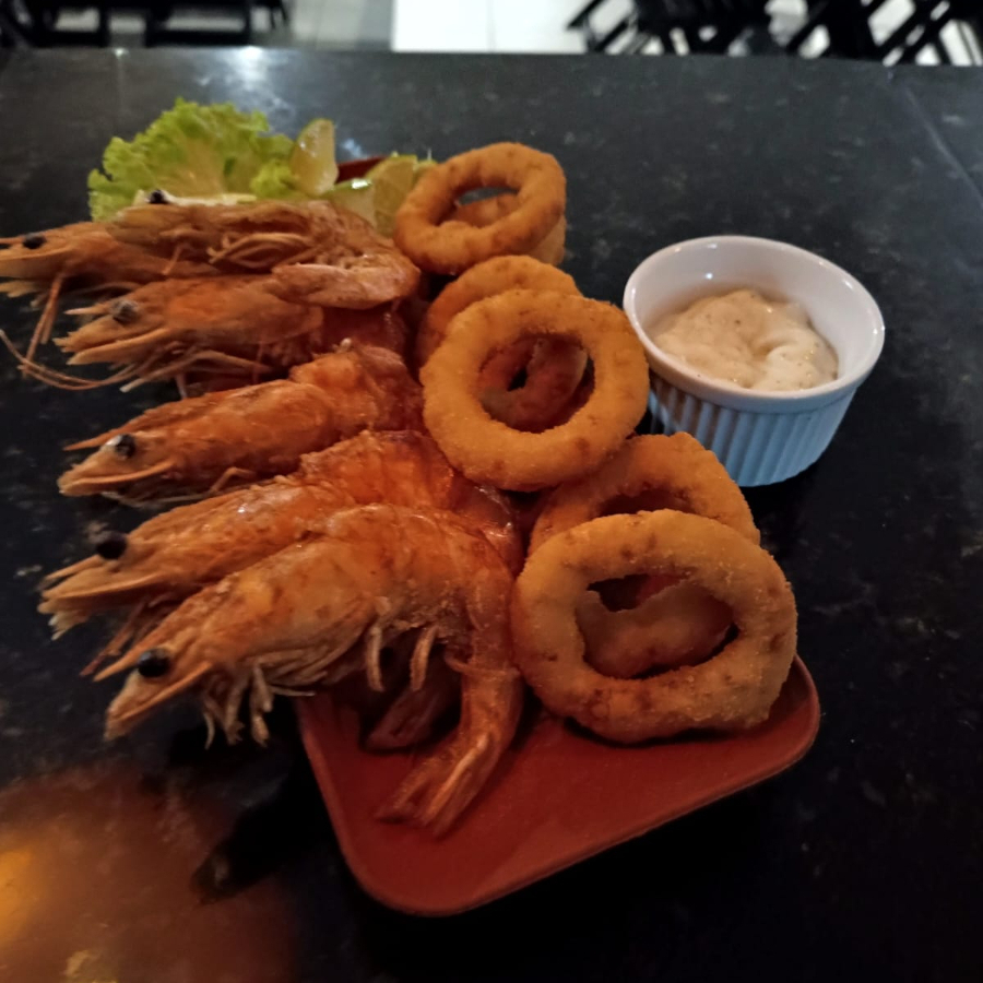 Camarão G empanado, de agua salgada acompanha anel de cebola formando 400g