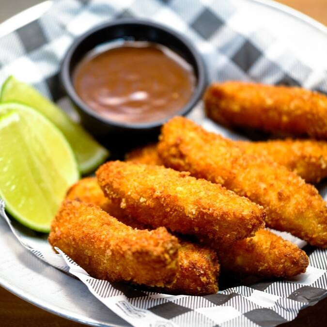 Tiras de peito de frango crocantes, empanadas e servidas com molho barbecue.