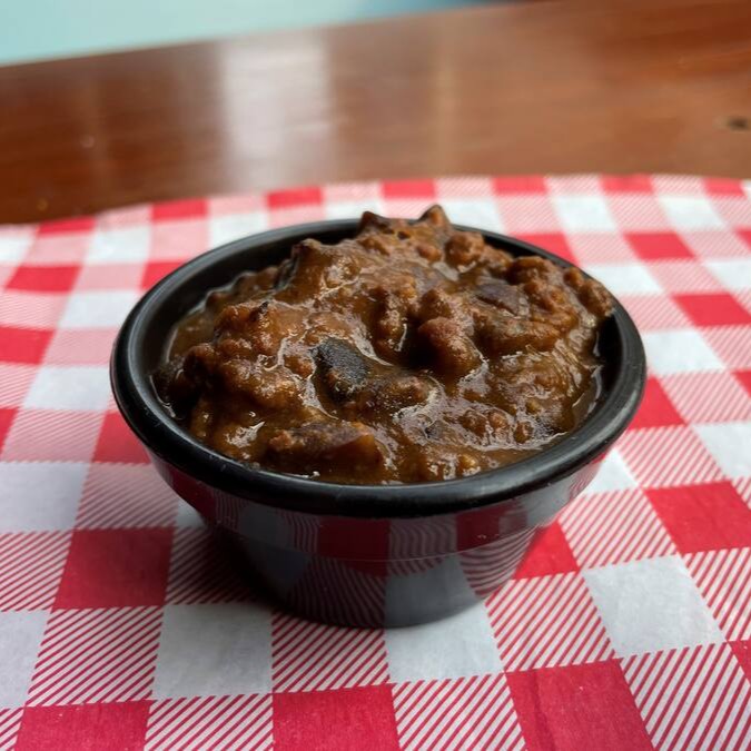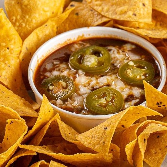 Chili com queijo derretido e jalapeños, servido com chips crocantes de tortilla de milho.
