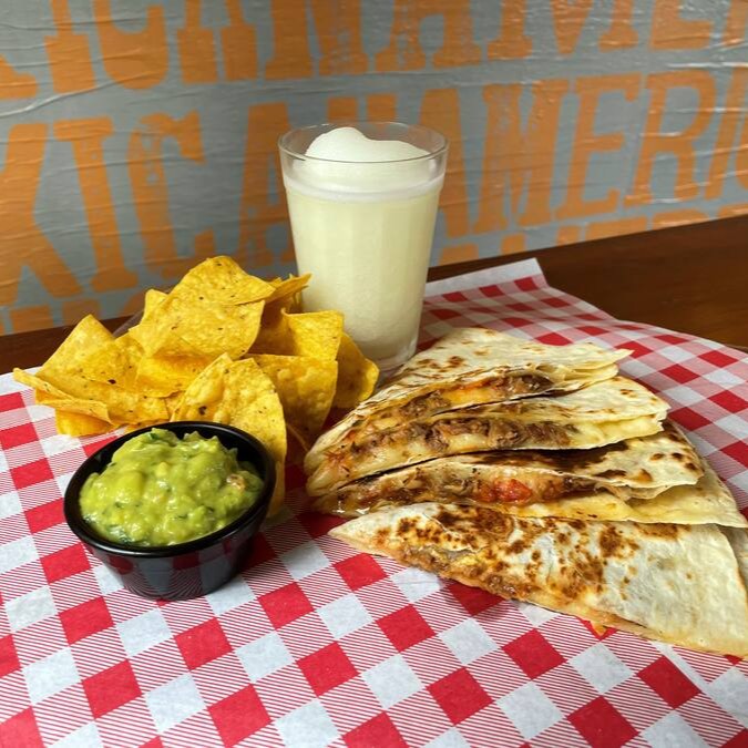Sua escolha de quesadilla acompanhada de nachos crocantes, molho à sua escolha (guacamole, salsa ranchera ou sour cream) e uma bebida refrescante.
