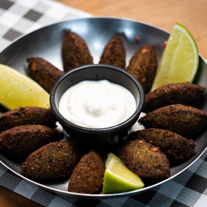Bolinhos de grão-de-bico dourados, servidos com sour cream cremoso.