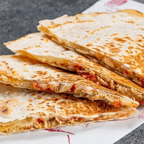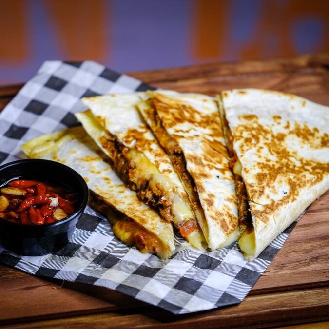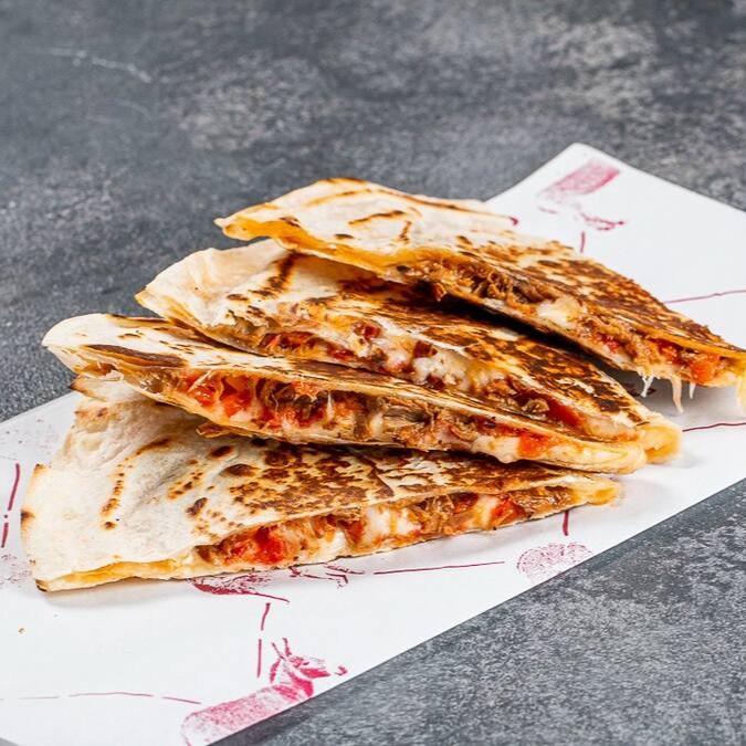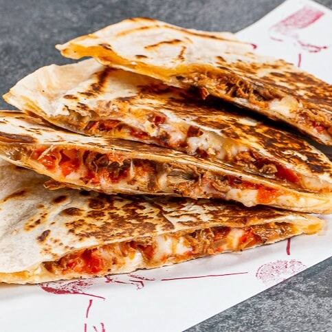 Quesadilla: tortilla de trigo macia recheada com queijo, salsa ranchera e proteína à sua escolha.
