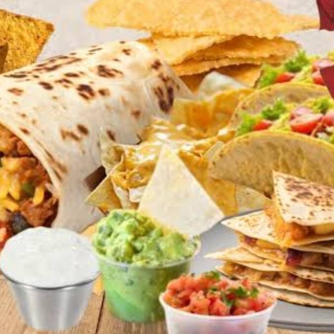 Tortilla de trigo recheada com guacamole, sour cream, pico de gallo, jalapeños, queijo, arroz, feijão e Carne Bovina + Quesadilla: tortilla de trigo macia recheada com queijo, salsa ranchera e Frango