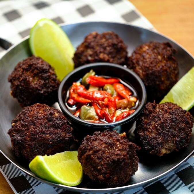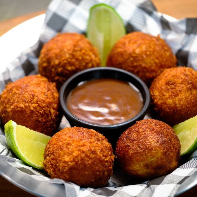 Croquetes de porco recheados com jalapeño e queijo, servidos com molho barbecue.