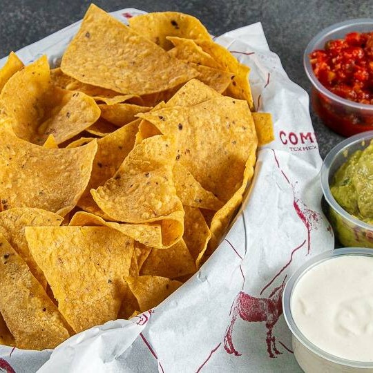 Chips crocantes de tortilla de milho acompanhados de três molhos à sua escolha: guacamole, salsa ranchera e sour cream.