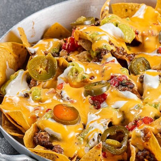 Chips crocantes de tortilla de milho, cobertos com chili, molho queso cremoso, guacamole, pico de gallo, sour cream e jalapeños. Enviados separadamente para manter a crocância e o frescor de cada ingrediente.