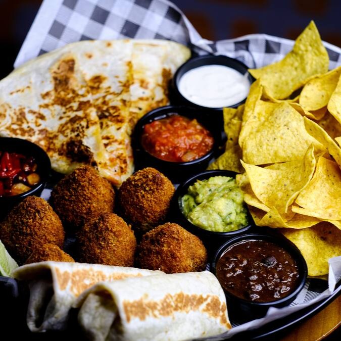 Uma seleção de alguns dos nossos deliciosos pratos: escolha de porção + mini burritos + nachos com molhos.