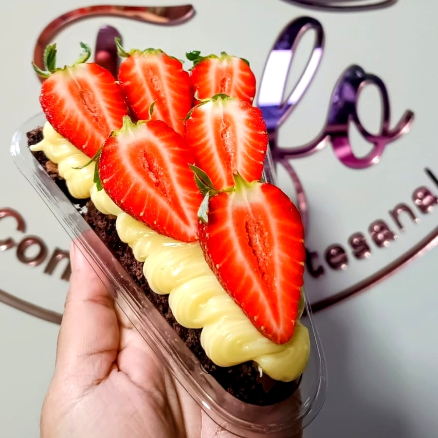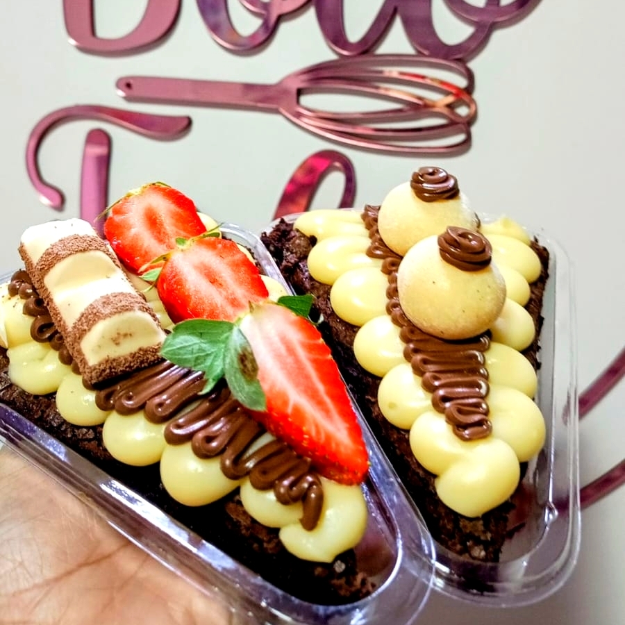 brownie, creme de ninho, creme de chocolate ao leite, morango