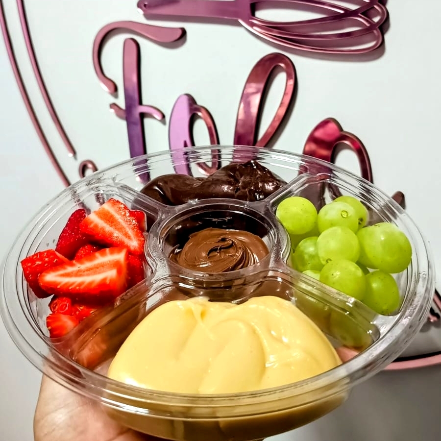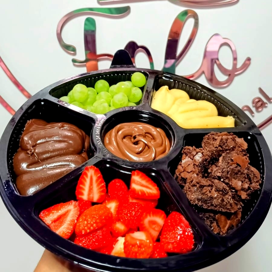 morangos frescos, uva verde, brownie, creme de ninho, creme de chocolate e nutella