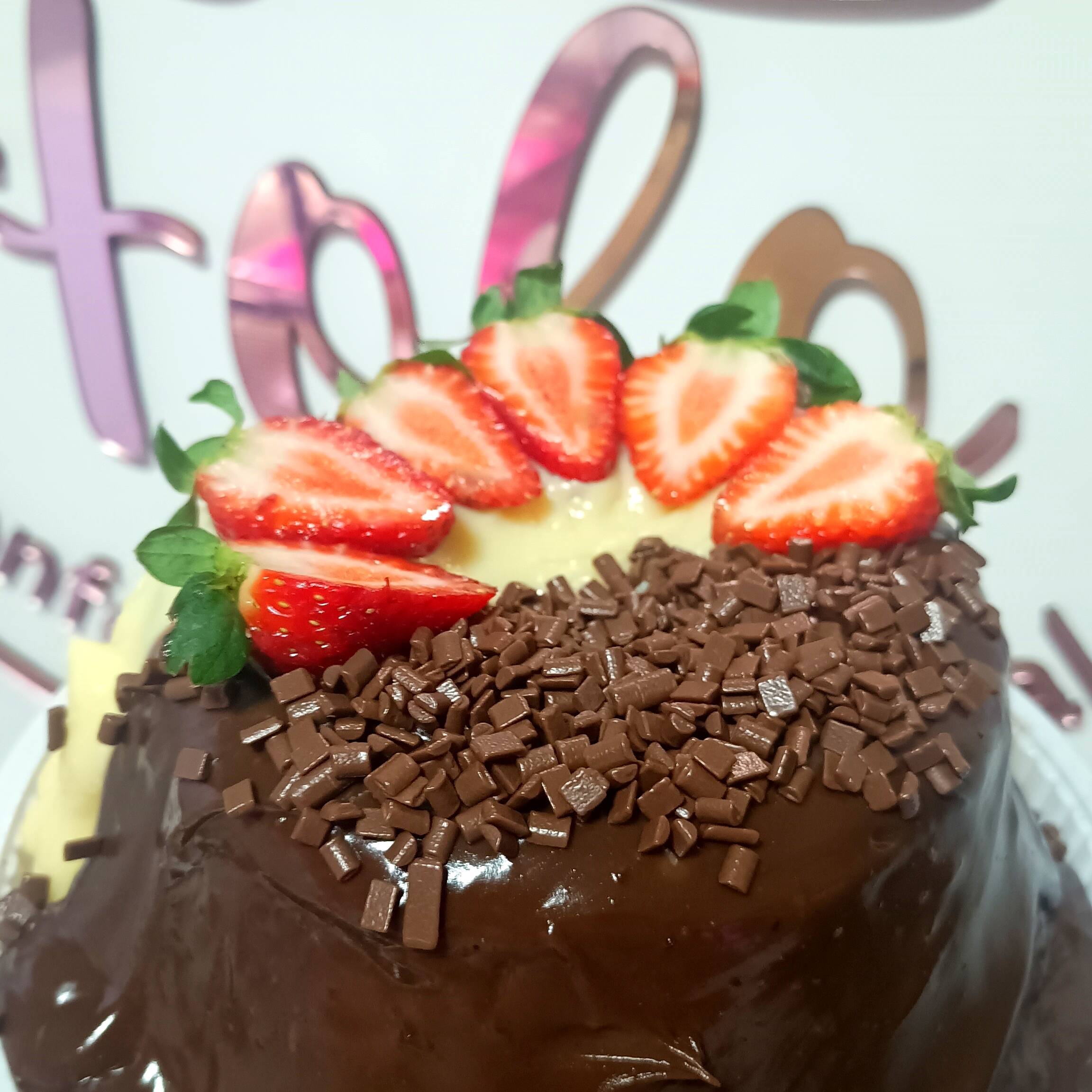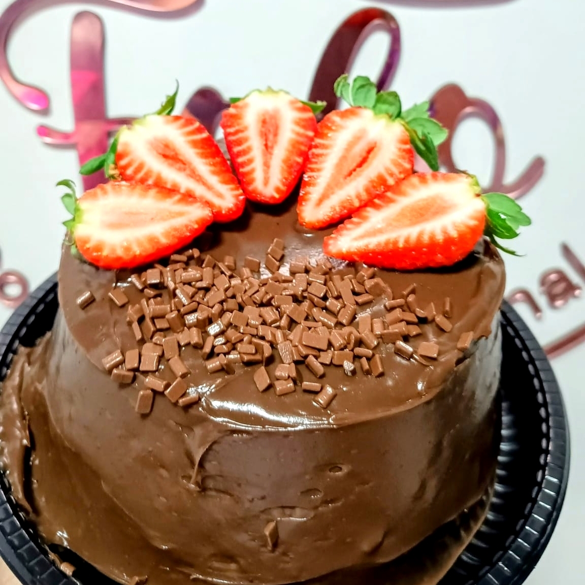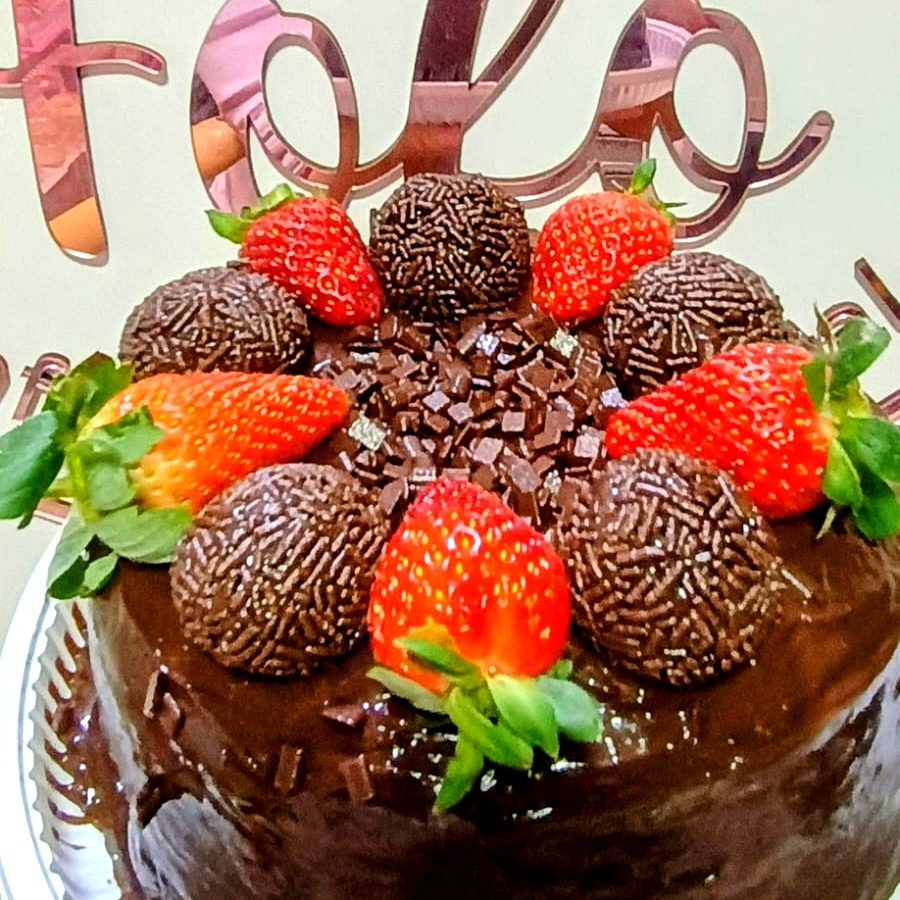 Massa de chocolate, creme de chocolate, brigadeiro e morango