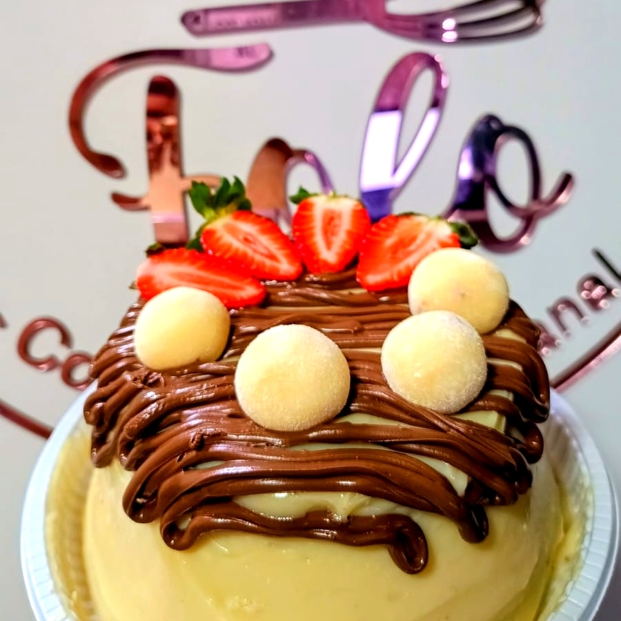 massa de chocolate, creme de ninho, creme de chocolate e morango