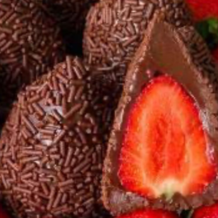 O Bombom de Morango, uma guloseima clássica que combina a acidez e o frescor da fruta com a doçura do chocolate. O núcleo é um morango fresco e suculento envolto em uma camada de creme de chocolate.