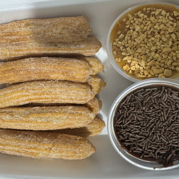 8 churros e 2 potinhos com recheio (Doce de leite e brigadeiro)