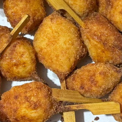 Esta porção oferece 25 unidades da mini coxinha, o petisco brasileiro mais amado, em um formato prático no palito. As coxinhas são preparadas com uma massa macia e saborosa, recheadas com frango bem temperado, e fritas para garantir uma casquinha crocante e sequinha. Perfeitas para servir de forma rápida e deliciosa.