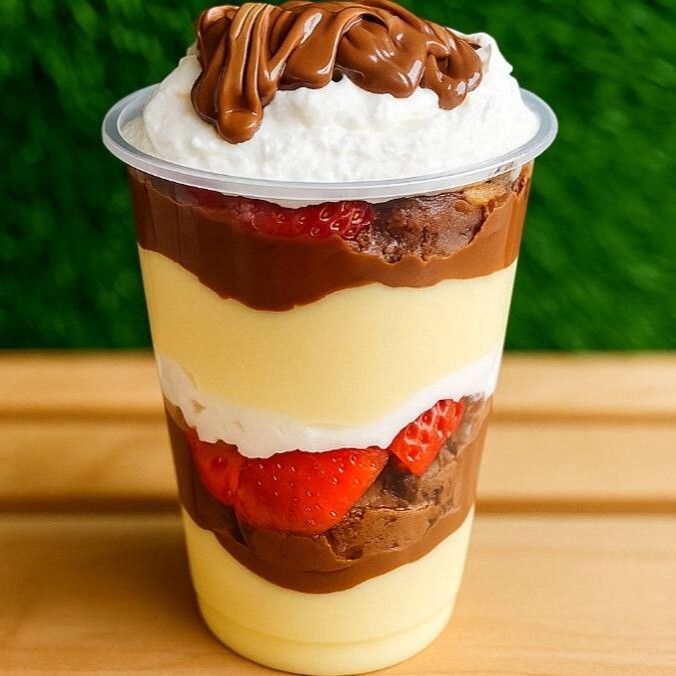 Brigadeiro cremoso de Ninho, Nutella , brownie, morangos picados e creme chantininho. ( Atencao : Nao Tiramos Ou Trocamos Ingredientes Do Copo )