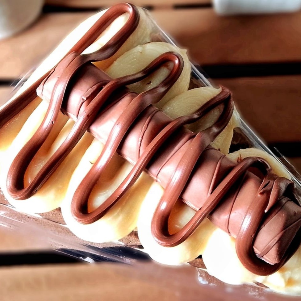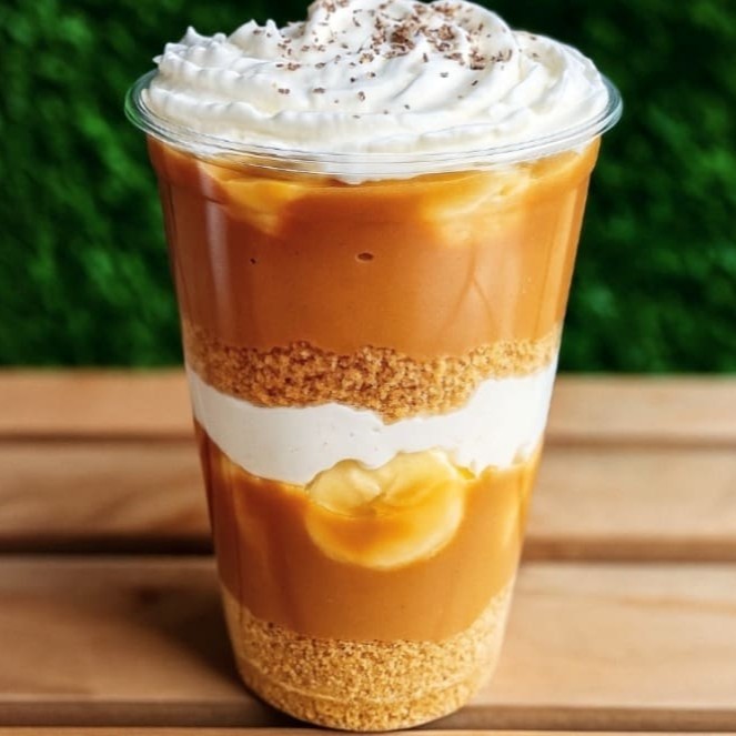 2 Camadas de farofa úmida com bolacha maisena e manteiga, doce de leite caseiro cremoso, pedaços de banana, chantilly e polvilhado com chocolate em pó 30%. ( Atencao : Nao Tiramos Ou Trocamos Ingredientes Do Copo )