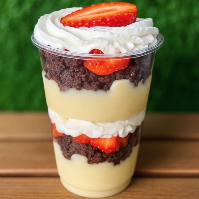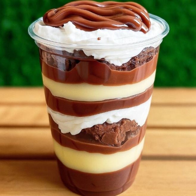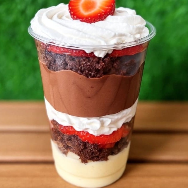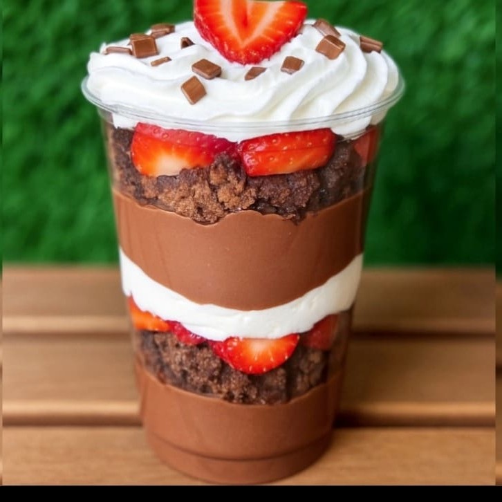 Camadas de brigadeiro cremoso de Ninho , camadas de brigadeiro gourmet chocolate, brownie, morangos picados e creme chantininho . ( Atencao : Nao Tiramos Ou Trocamos Ingredientes Do Copo )