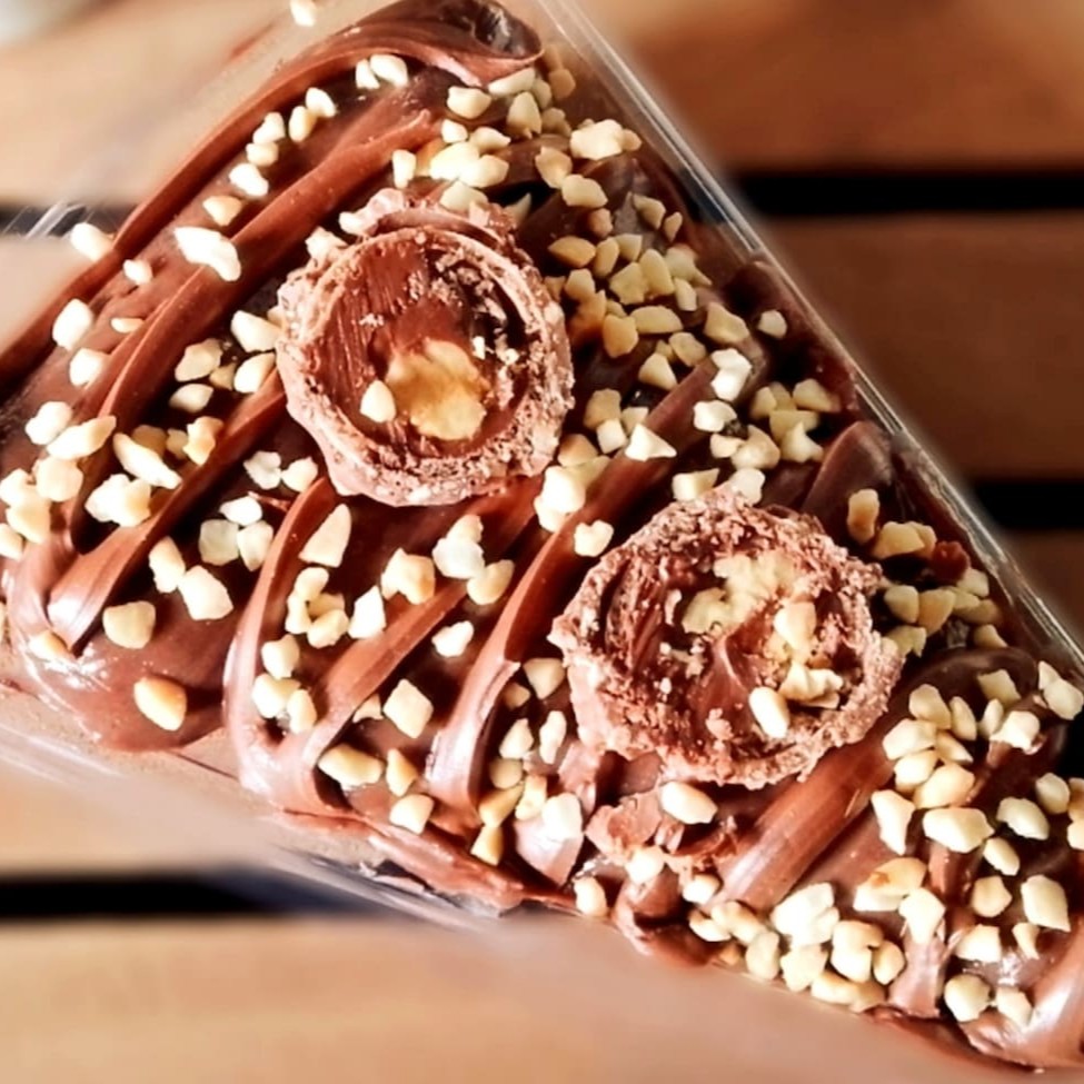 Brownie cremoso, recheio de brigadeiro gourmet, fios de Nutella, amendoim triturado e bombom ferrero rocher, delicioso!