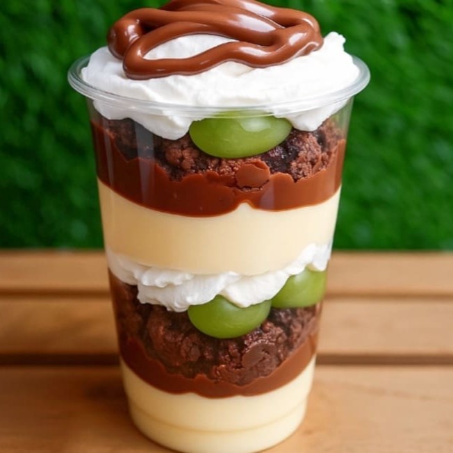 Brigadeiro cremoso de Ninho, Nutella , brownie, uva e creme chantininho. ( Atencao : Nao Tiramos Ou Trocamos Ingredientes Do Copo )