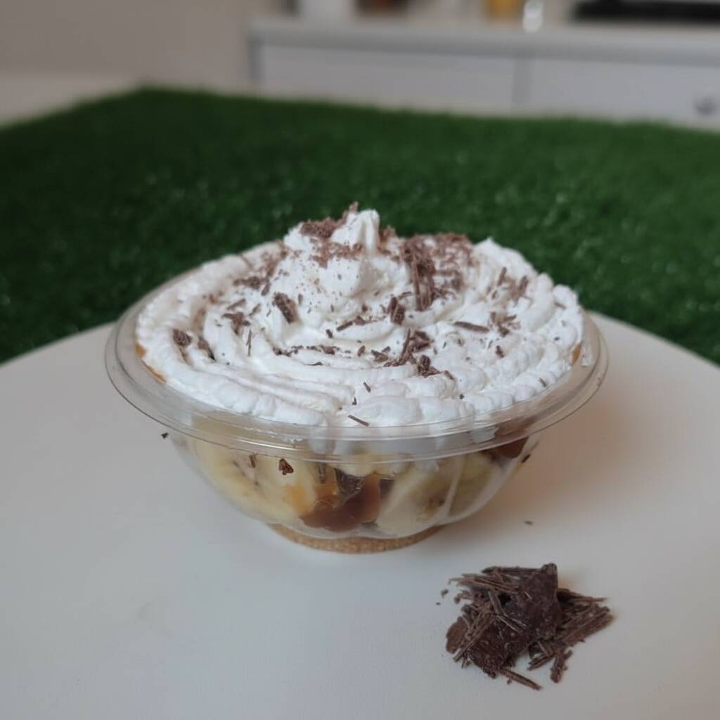 Delicie-se com a perfeita e mais deliciosa torta banoffe da cidade. Nossa irresistível combinação com uma base de biscoito, nosso maravilhoso doce de leite sedoso, bananas selecionadas e um creme de chantinho com raspas de chocolate dos deuses que vai conquistar seu paladar a cada mordida, enquanto os sabores se misturam em uma explosão de prazer. ( 160g aproximadamente )