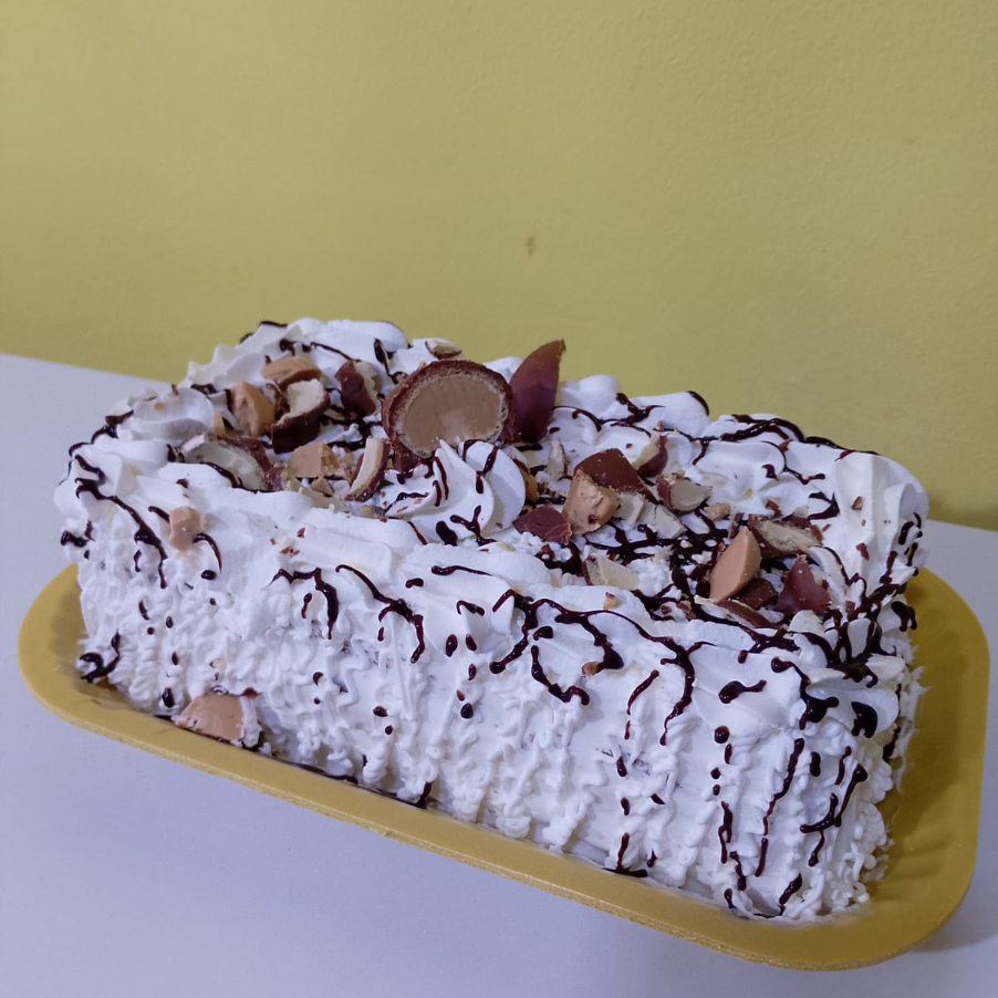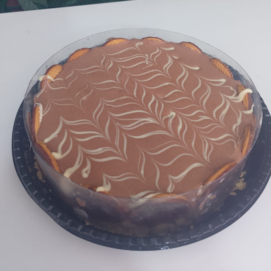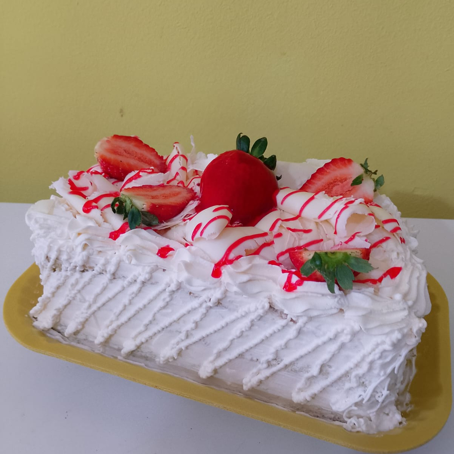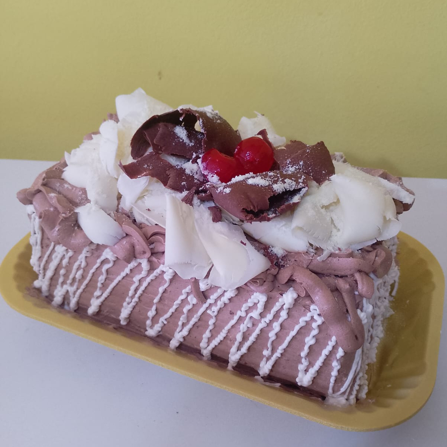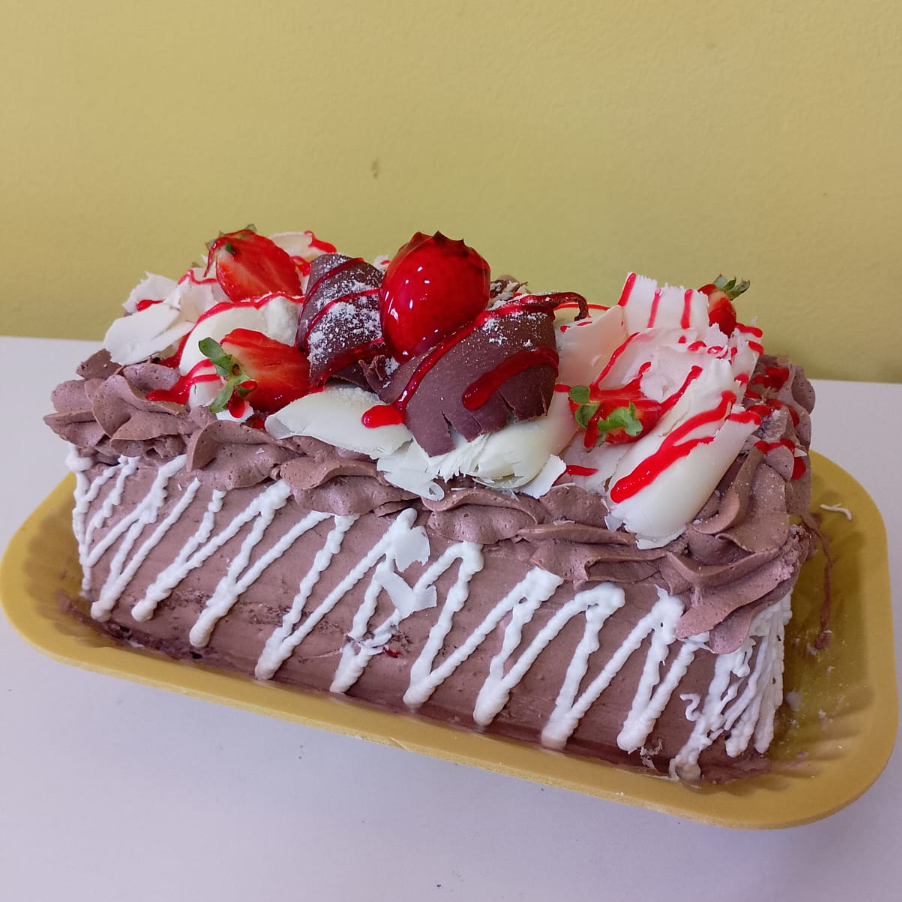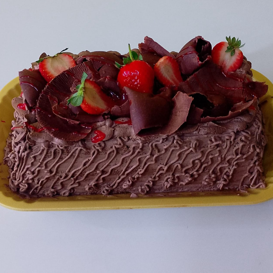 massa de chocolate, recheio de leite ninho com morango, cobertura mousse de chocolate com raspa de chocolate meio amargo e raspa de chocolate branco.
