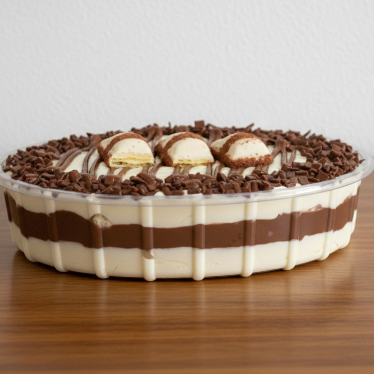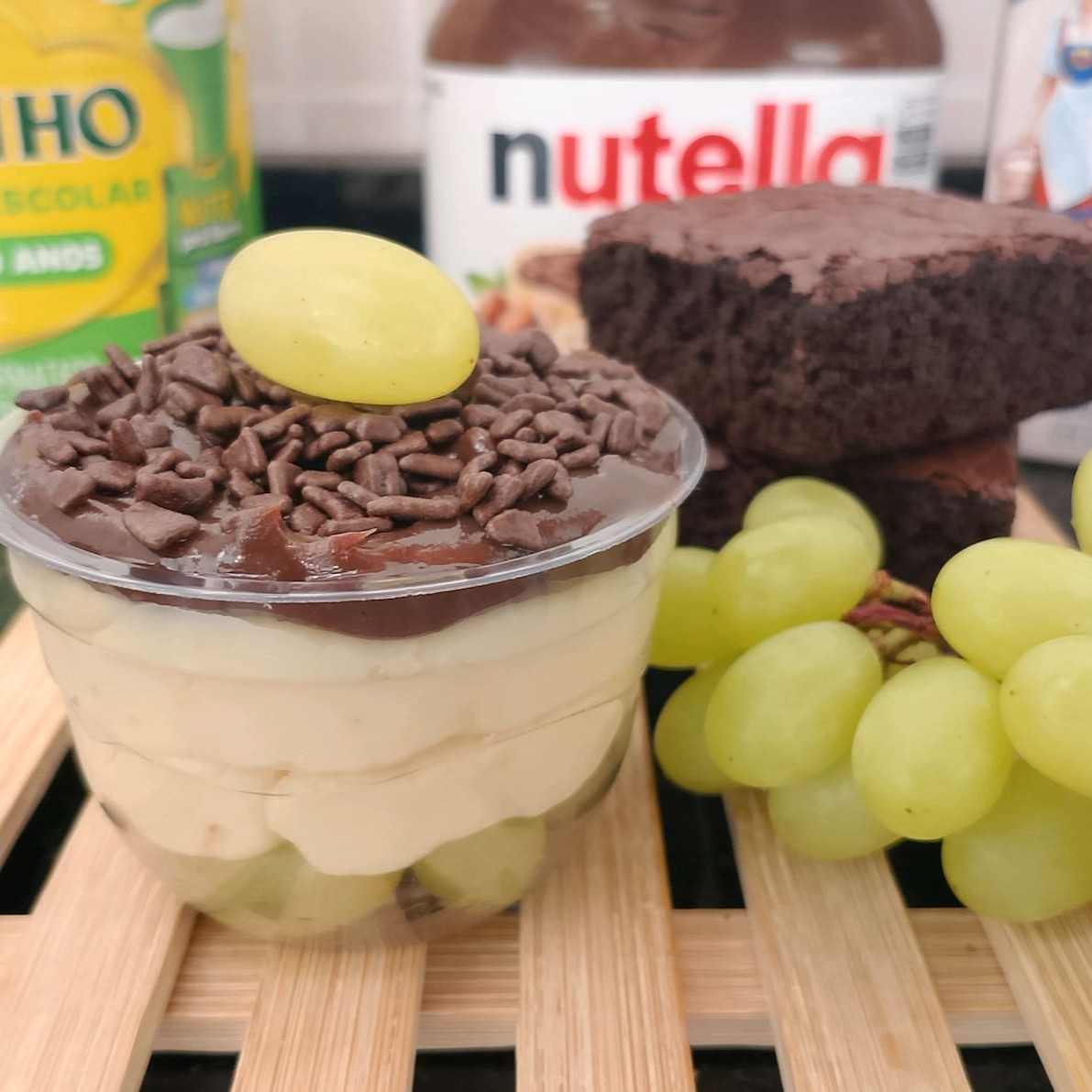 Travessa composta por creme branco, Nutela, creme de chocolate, pedacinhos de brownie, finalizado com Nutela e bombom kinder bueno