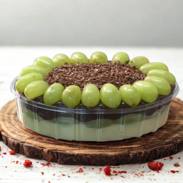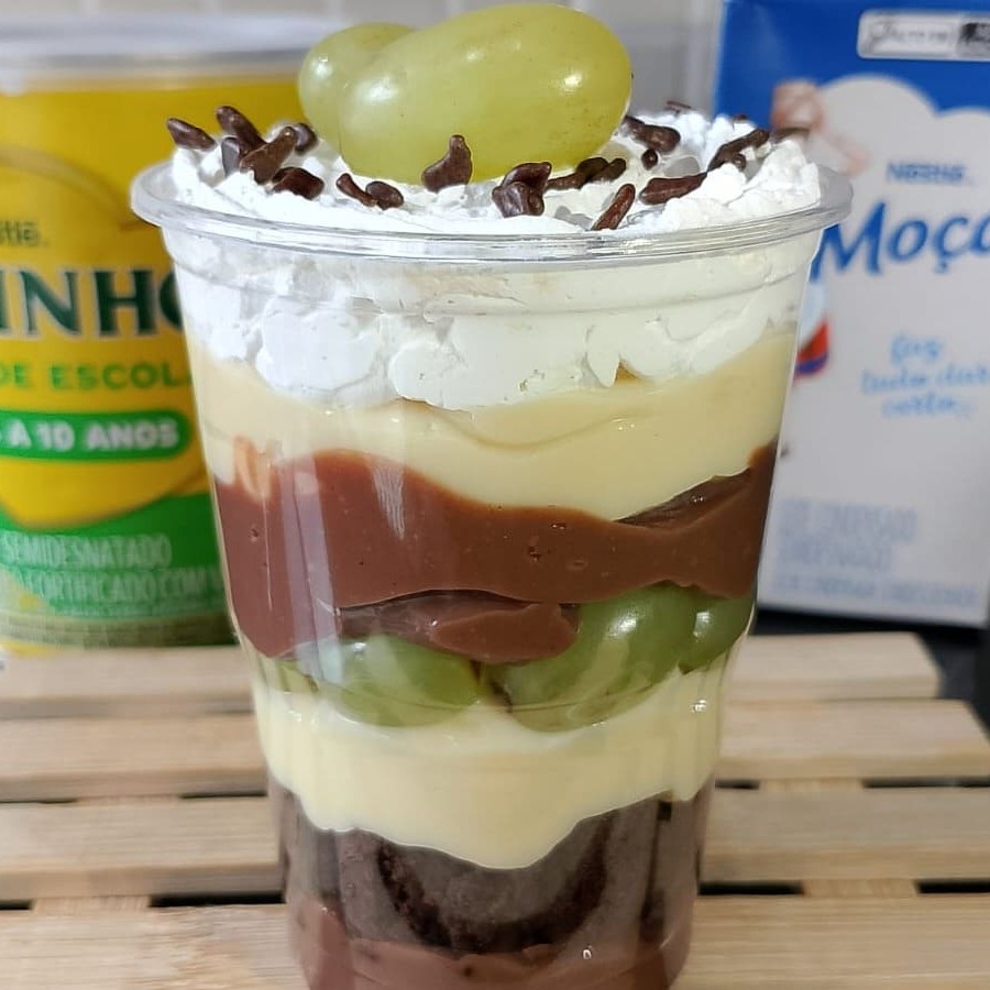 Uma sobremesa delicada e refrescante: camadas de creme branco suave, uvas fresquinhas e uma cobertura irresistível de chocolate. A combinação perfeita entre doçura, leveza e frescor!