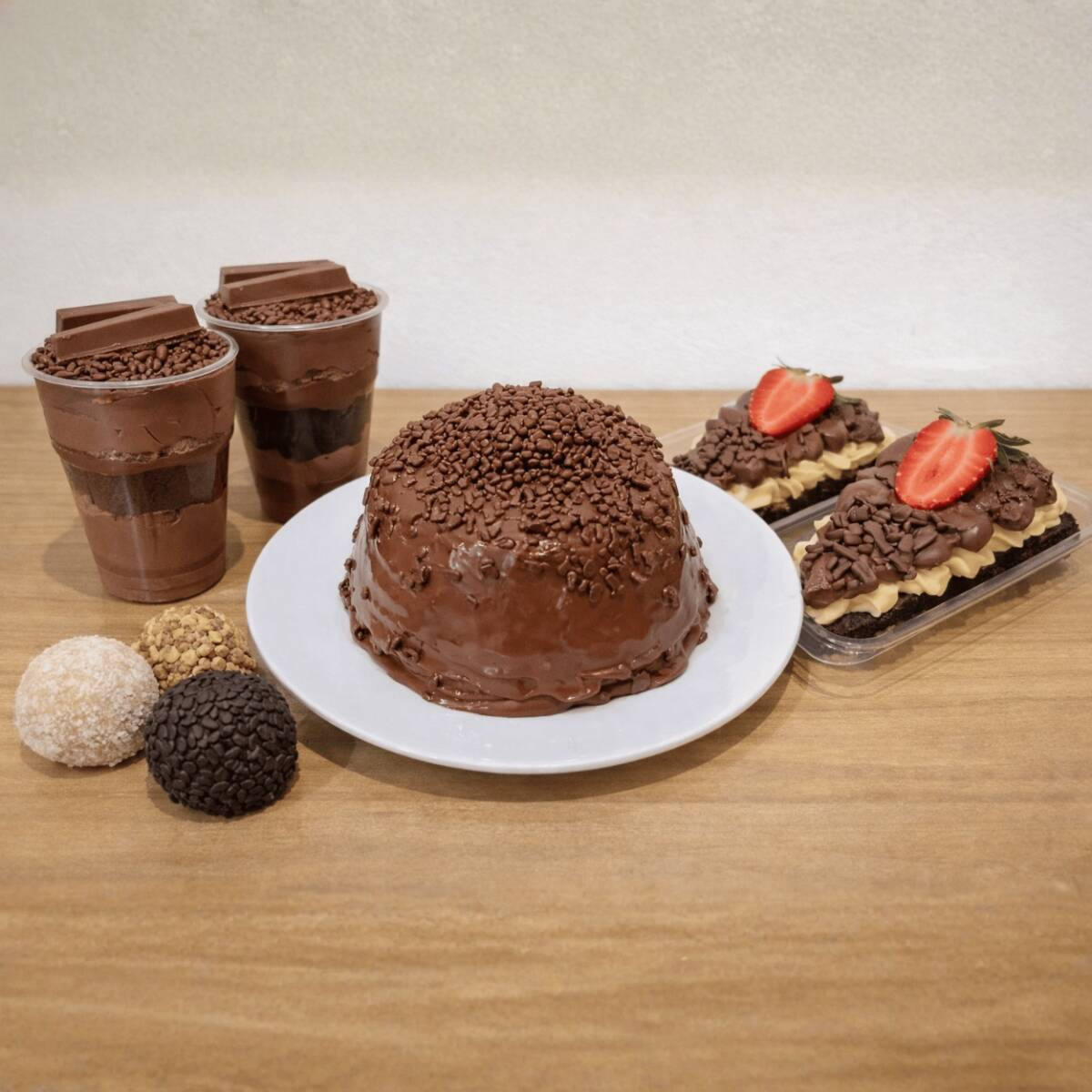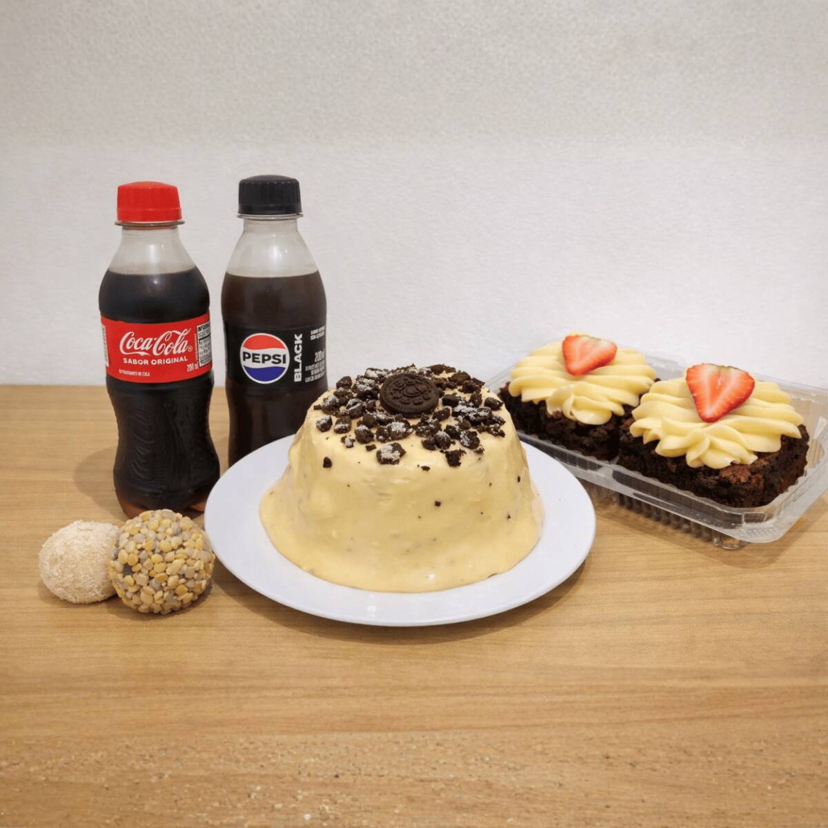 Combo composto por 2 afogadinhos de brownie ninho, 1 bolo Oreo, 2 brigadeiros e 2 bebidas