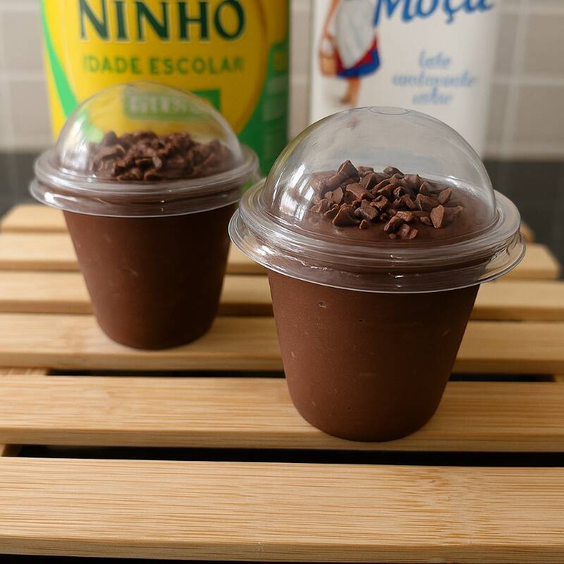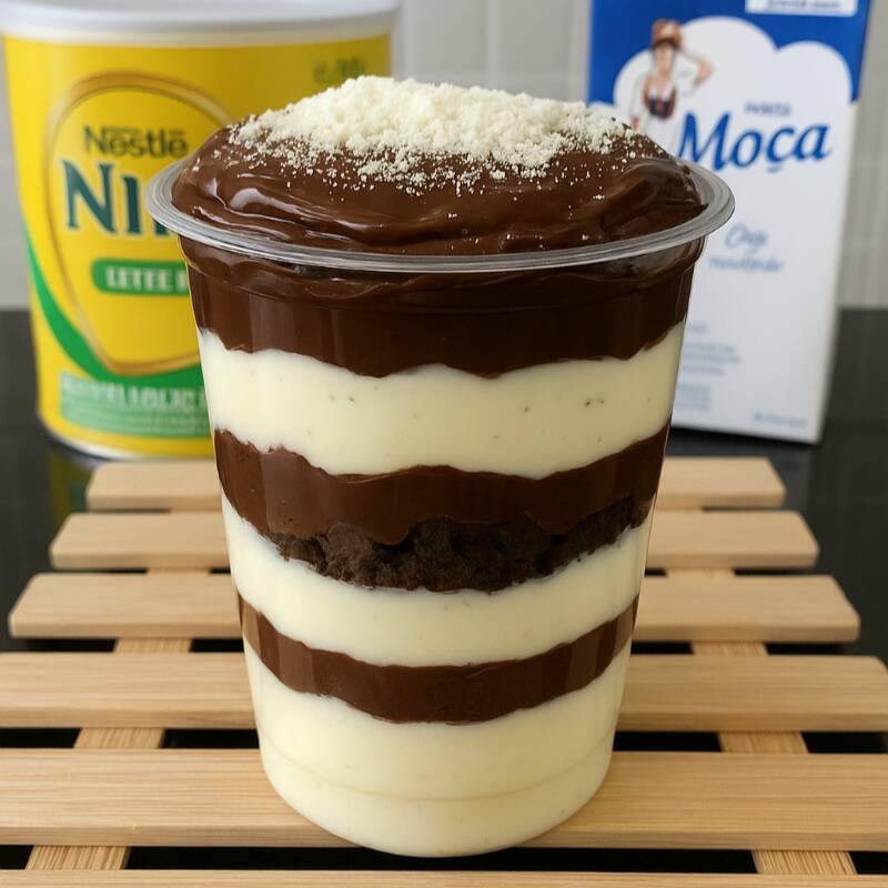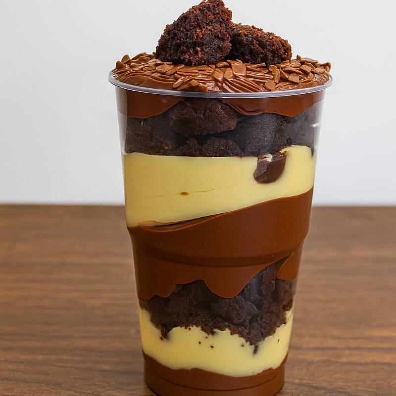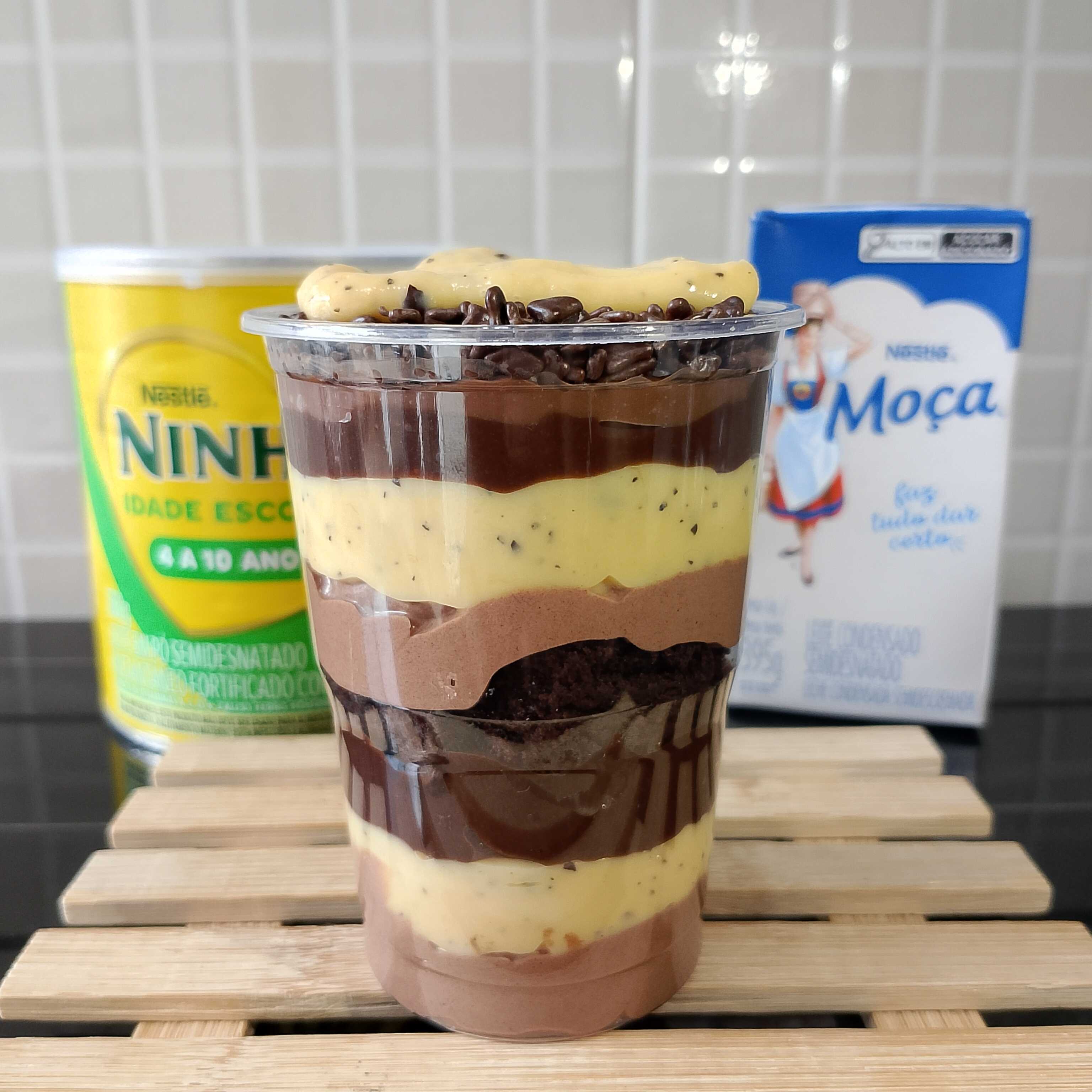 Camadas de creme de ninho, creme de chocolate e pedaços de brownie macio