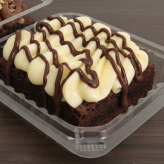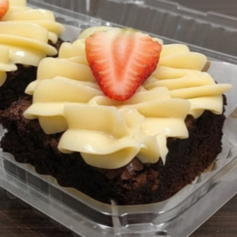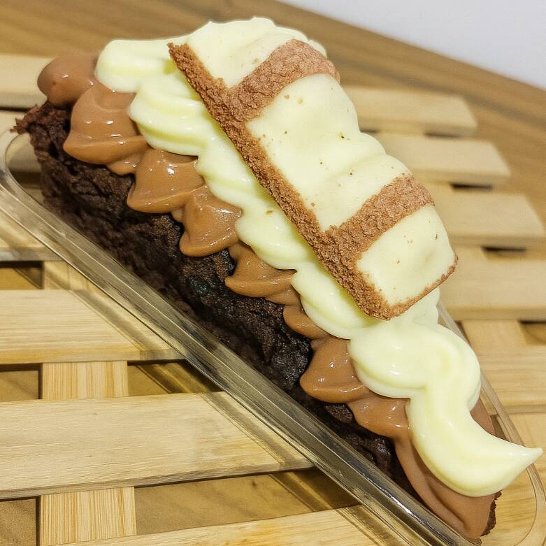 Fatia de brownie com cobertura cremosa de chocolate e brigadeiro branco, finalizado com morango ou uva