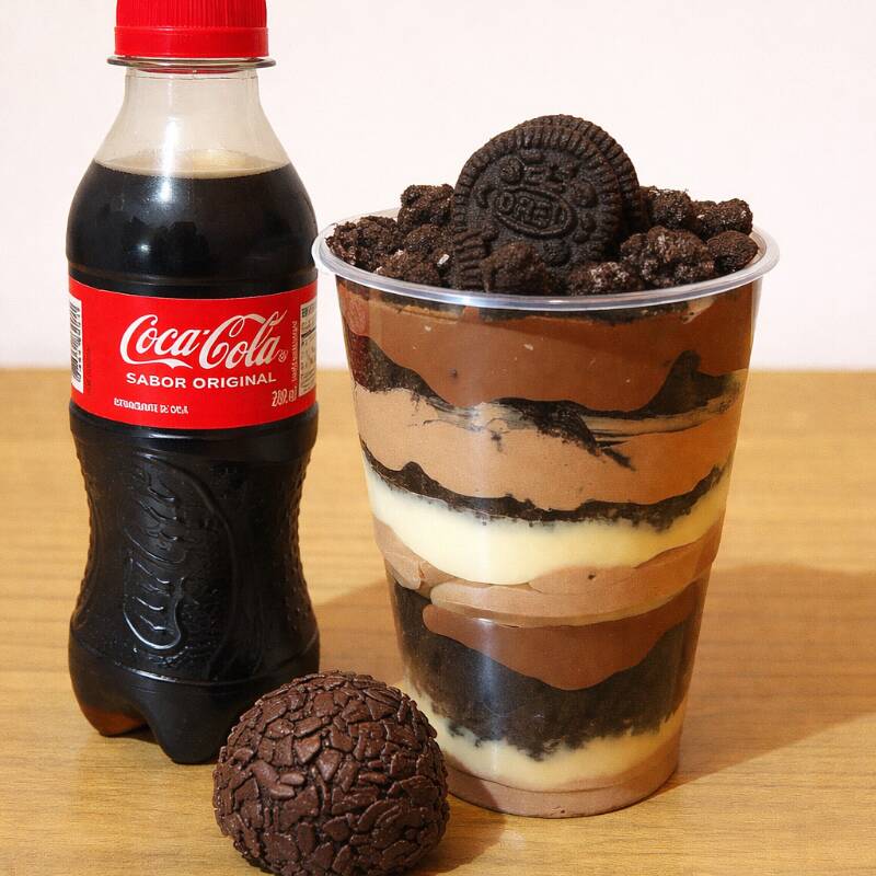 Combo composto por 1 copo da felicidade Oreo, um brigadeiro (tradicional ou ninho) e uma bebida (coca ou Pepsi)