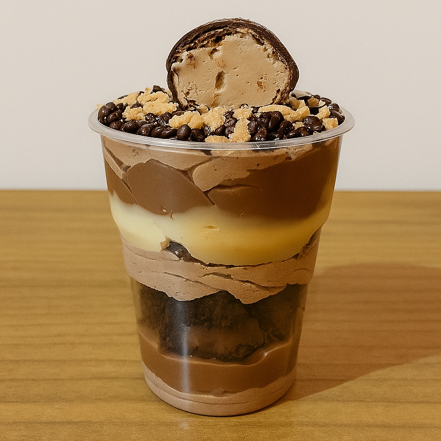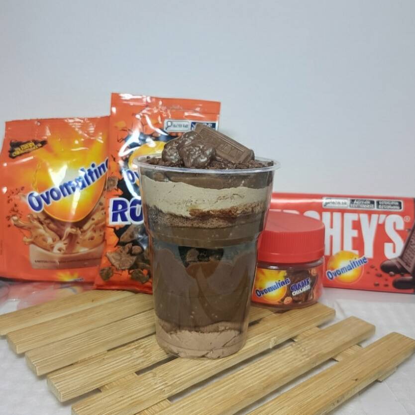 Camadas de mousse chocolate, creme de chocolate, creme de ovomaltine, flocos de ovomaltine, pedaços de brownie, finalizado com ovomaltine rocks e chocolate Hershey's ovomaltine