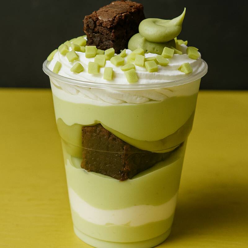 Camadas de creme de pistache, mousse de ninho e pedaços de brownie
