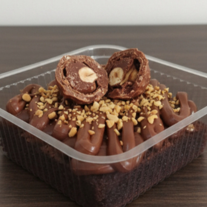 Pedaço de brownie com cobertura cremosa de chocolate e Nutella, finalizado com bombom Ferrero Rocher