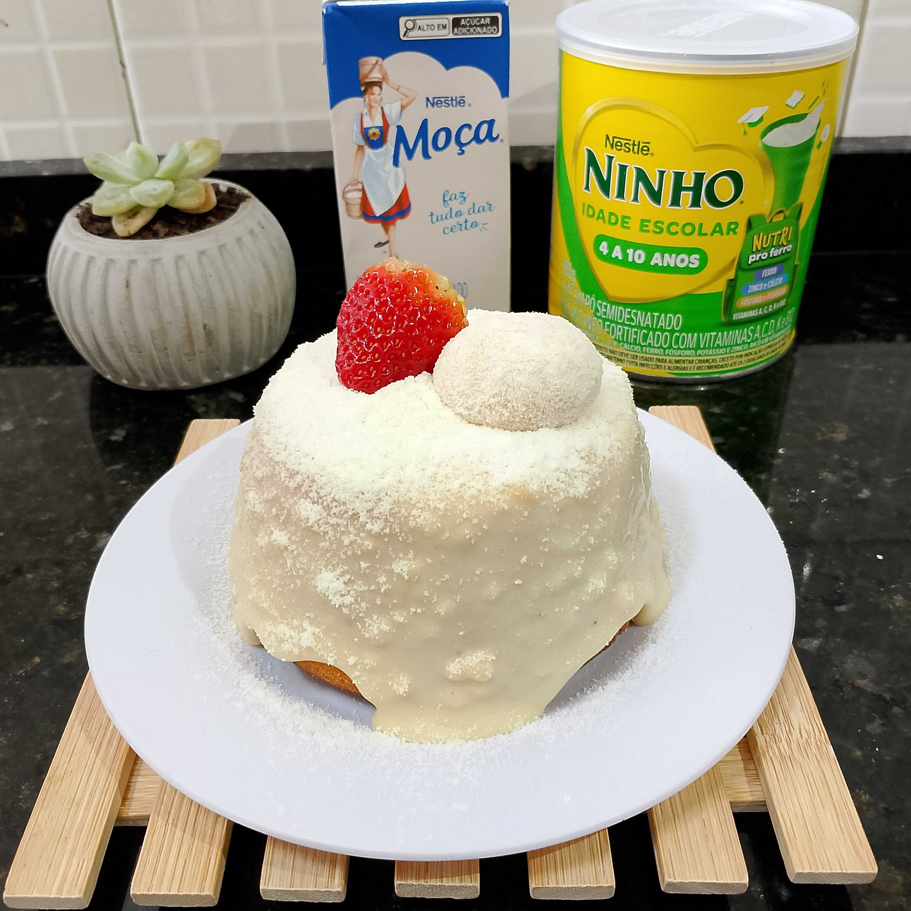 Bolo branco recheado com creme de ninho finalizado com morangos frescos