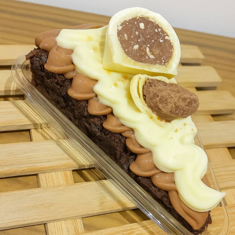 Fatia de brownie com cobertura de chocolate e chocolate branco finalizado com bombom ouro branco