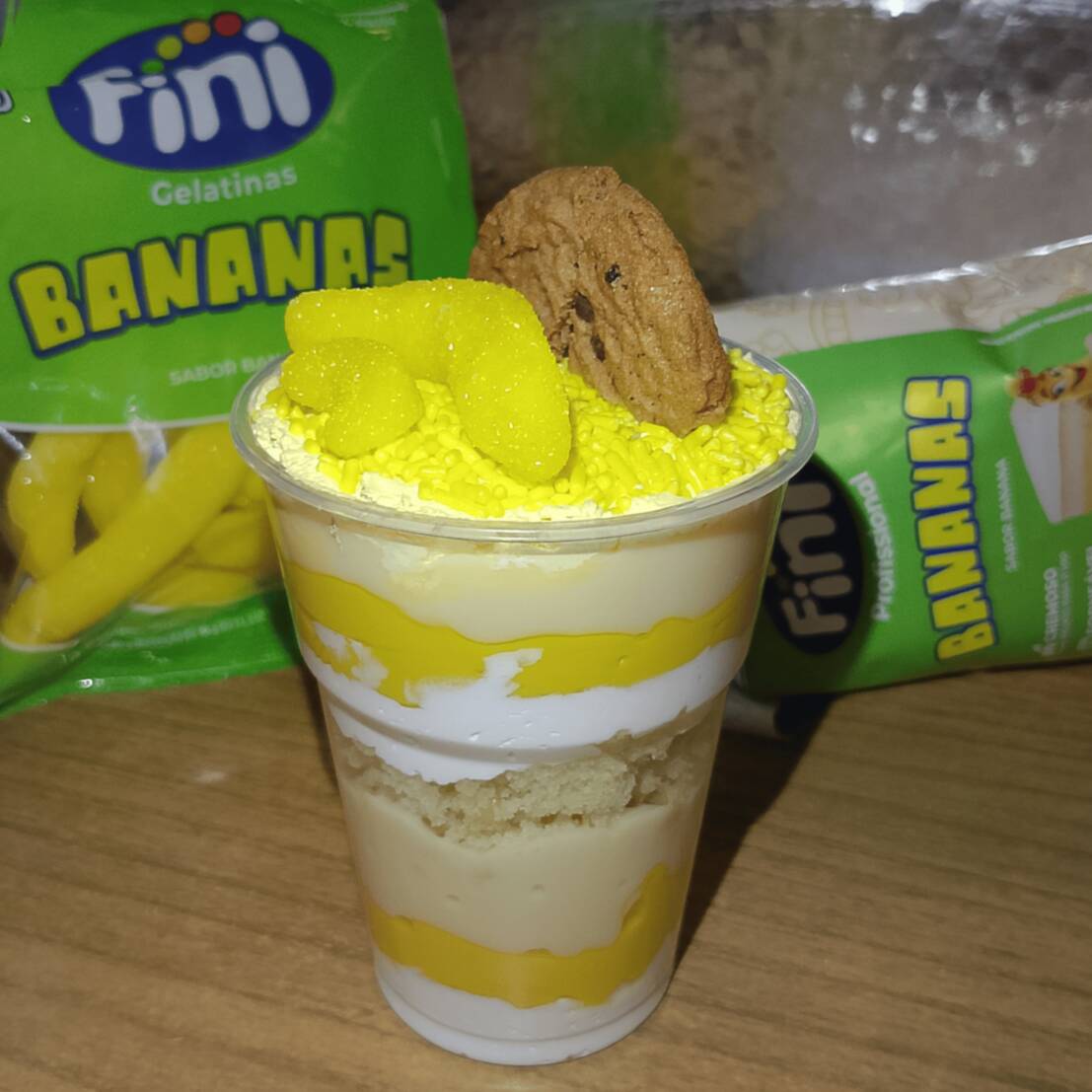 Camadas de creme de ninho, chantininho, recheio fini banana, bolo pão de ló, finalizado com fini banana e cookies sabor caribe (banana)