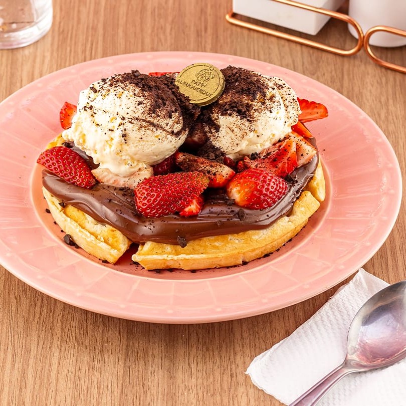 Delicioso waffle doce coberto com brigadeiro ao leite, pedaços de morango e acompanhado de sorvete de creme. Atenção: por conter sorvete essa sobremesa é sensível ao tempo. O sorvete é enviado em um pote separado.