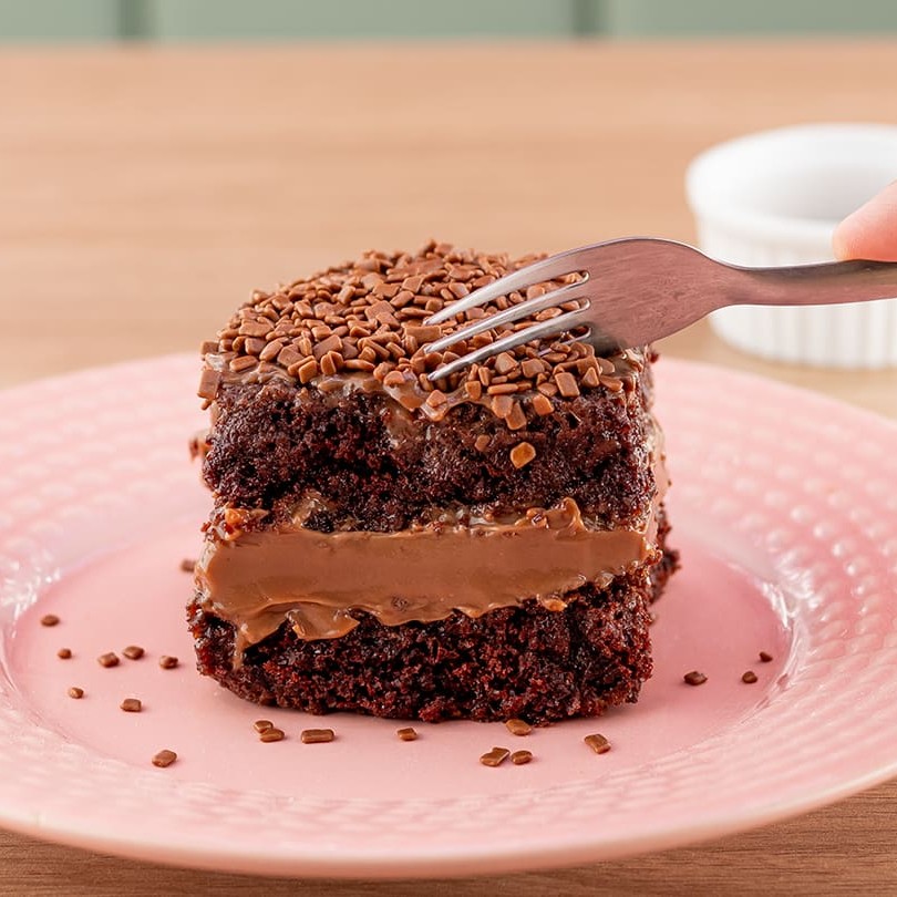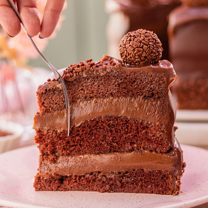 Delicioso bolo de Brigadeiro ao leite, massa de chocolate intercalada com recheio de brigadeiro ao leite e cobertura de brigadeiro ao leite com granulado.