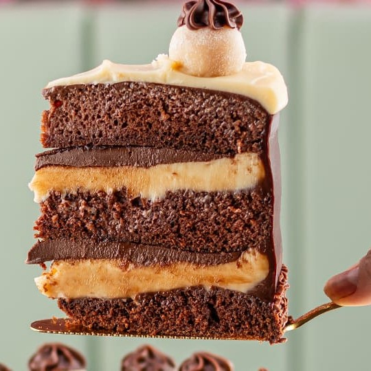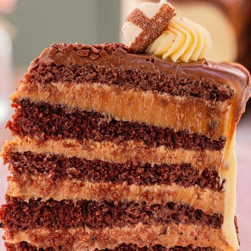 Fatia de bolo feita com massa de chocolate, brigadeiro a base de avelã e coberto com ganache de chocolate branco, decorado com Kinder Bueno.